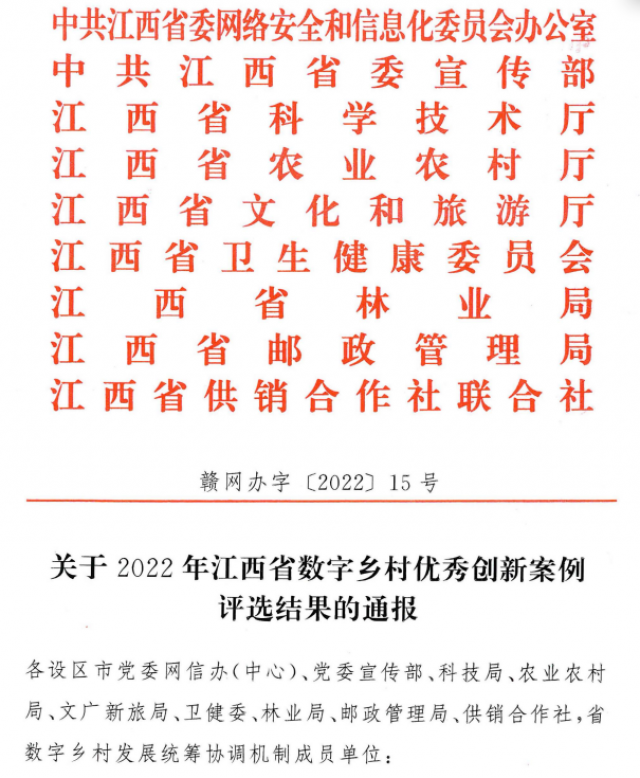 此次评选活动是由省委网信办联合省委宣传部、省科技厅、省农业农村厅、等九家单位共同举办,旨在贯彻落实《数字乡村发展行动计划(2022-2025)》《江西省实施数字乡村发展战略的意见》精神和省委省政府关于数字乡村工作的有关要求,遴选一批已实施建成、有创新成效、可复制易推广的优秀创新案例,为全省数字乡村建设树立典型示范,提供可参考借鉴经验,推动全省数字乡村建设工作深入开展,助力深化发展和改革双“一号工程”。